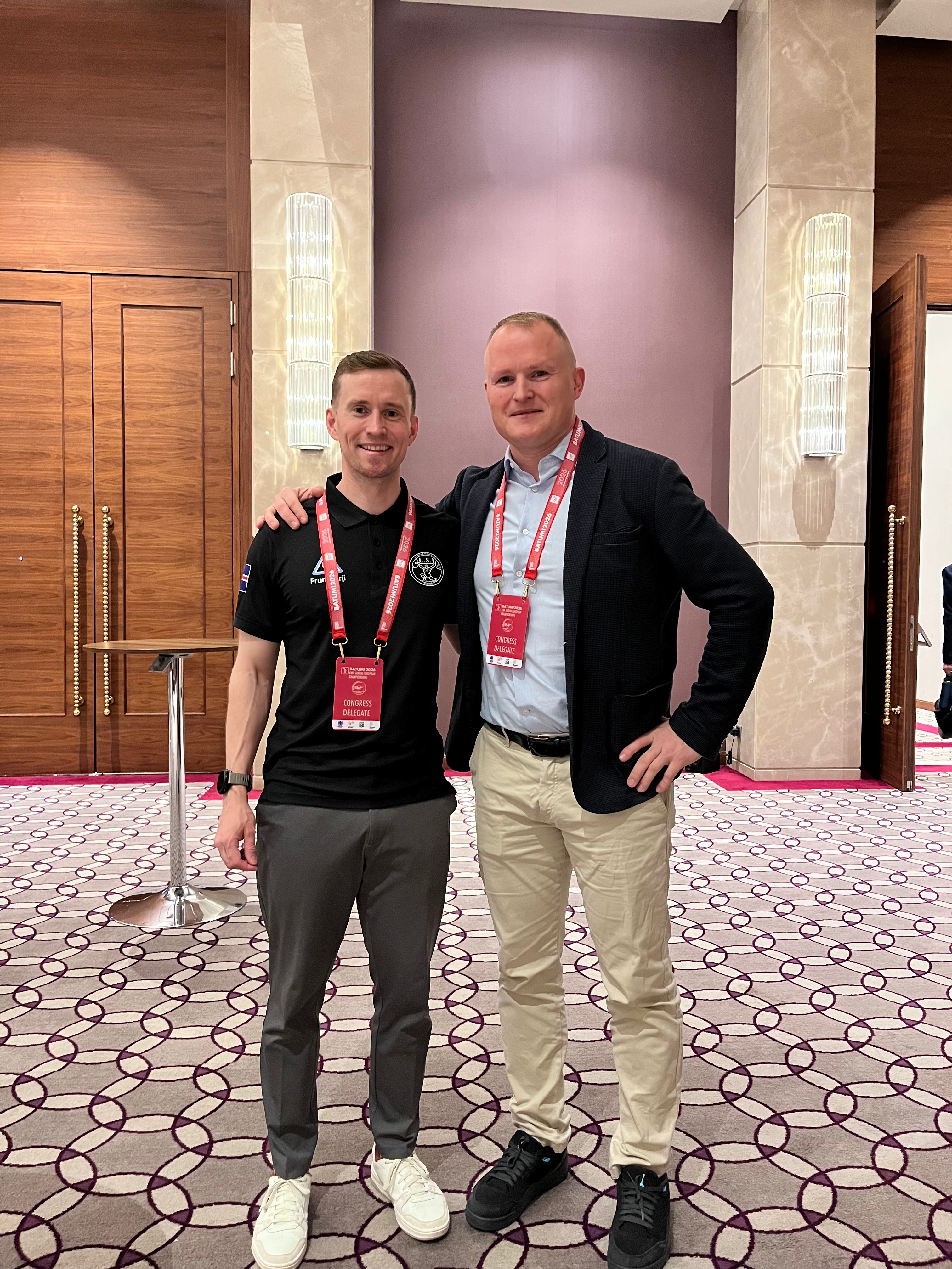 Arnór Ásgeirsson frá LSÍ og Modestas Simkus frá litháíska lyftingasambandinu á ársþingi EWF 2026