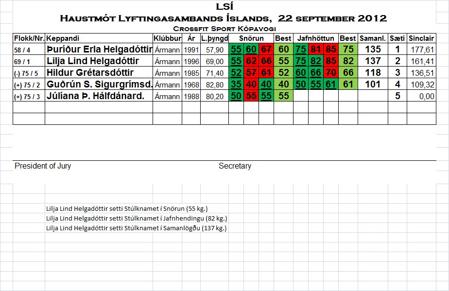 Lilja Lind Helgadóttir setti þrjú stúlknamet en hún er aðeins 16 ára gömul. Hún Snaraði 55 kg. og Jafnhenti 82 kg. og í Samanlögðu náði hún 137 kg. Lilja Lind mun keppa á Norðurlandamóti unglinga í lok október.