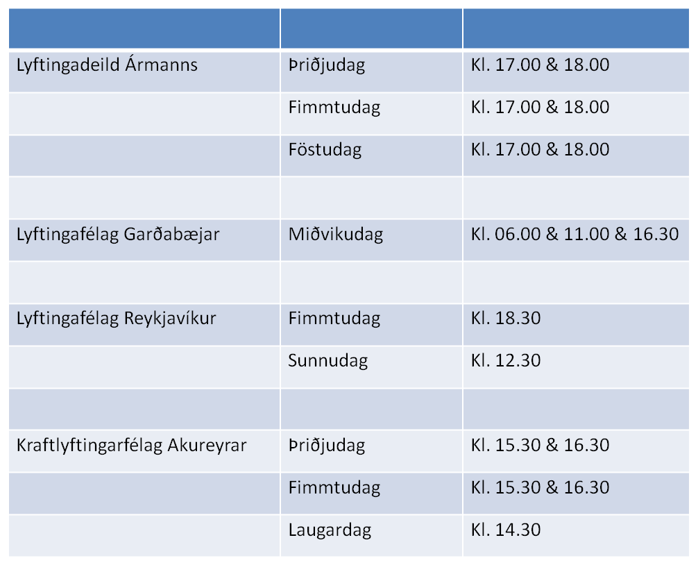 Innskot Birt þann september 20, 2013 af Lárus Páll Lyftingasaband Íslands vill benda þeim sem hafa áhuga á að stunda Ólympískar Lyftingar að skipulagðar tímar eru hjá eftirfarandi félögum; Deila: Click to share on X(Opnast í nýjum glugga) X Click to share on Facebook(Opnast í nýjum glugga) Facebook Click to share on LinkedIn(Opnast í nýjum glugga) LinkedIn Líka við Hleð... Tengt efni