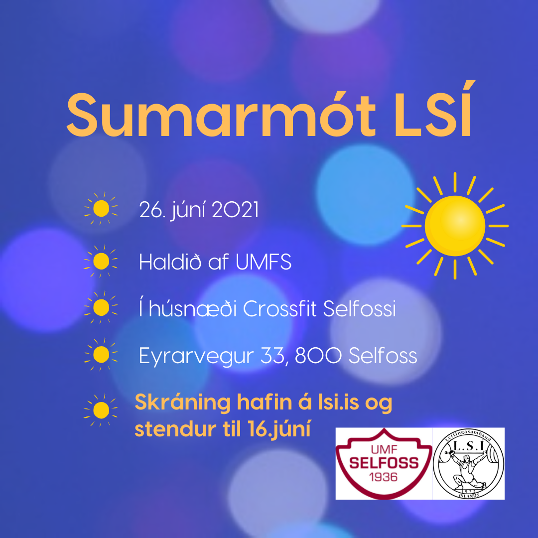 Sumarmót LSÍ verður haldið að þessu sinni af UMFSelfoss í húsnæði Crossfit Selfoss þann 26. júní næstkomandi. Frekari upplýsingar um mótið munu birtast á heimasíðu LSÍ eftir skráningu en henni lýkur 16. júní.