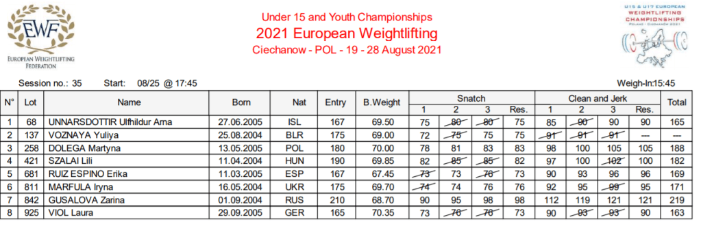 Úlfhildur Arna Unnarsdóttir (f. 2005) keppti á Evrópumeistaramóti Youth á dögunum og þá á hennar fyrsta stórmóti. Úlfhildur hafnaði í 6. sæti í -71 kg flokki meyja með 75 kg í snörun, 90 kg í jafnhendingu og 165 kg í samanlögðu sem er einungis 3 kg frá hennar besta árangri á móti en á hún 168 kg í samanlögðu eftir Sumarmóti LSÍ í júní síðastliðinn.