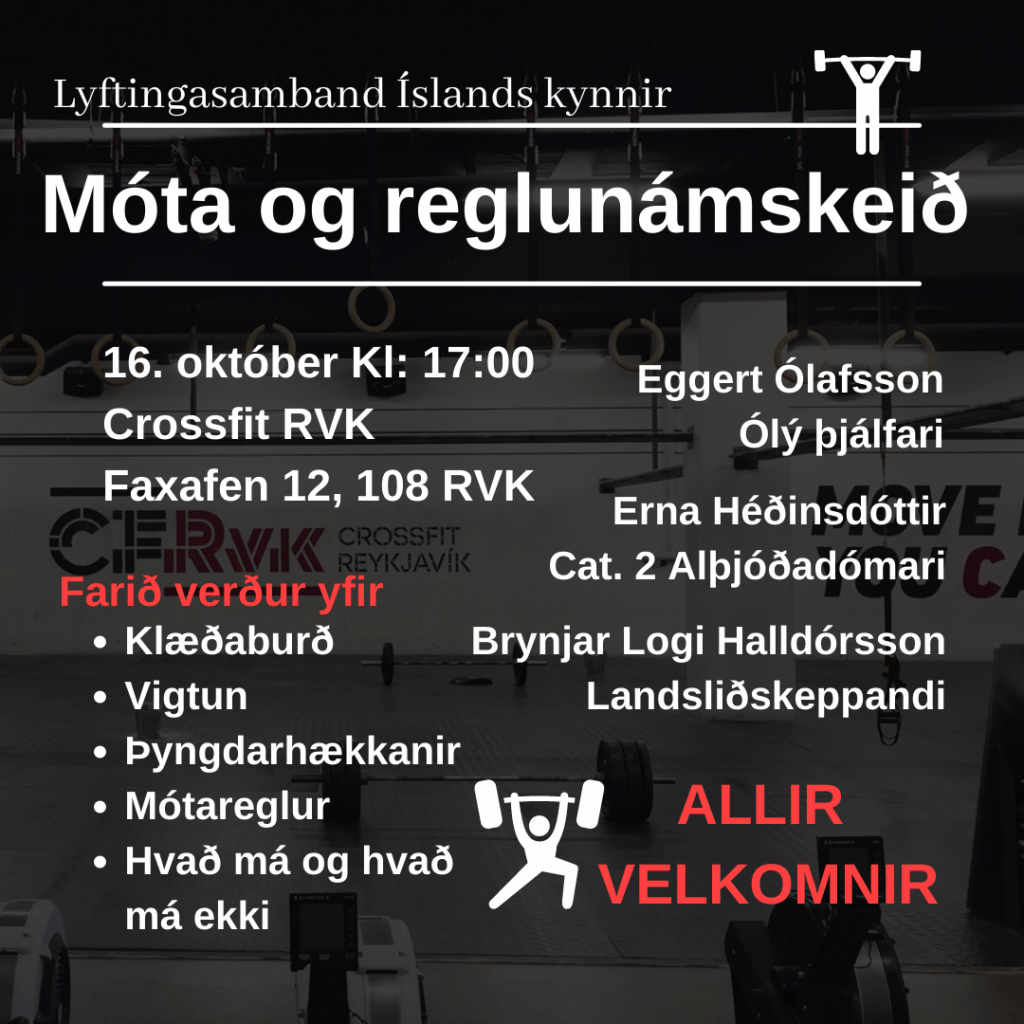 Næsta laugardag, 16. október munu þau Erna Héðinsdóttir Cat. 2 alþjóðadómari, Eggert Ólafsson þjálfari í Ólympískum lyftingum og Brynjar Logi Halldórsson Landsliðskeppandi standa fyrir móta og reglunámskeiði fyrir keppendur, þjálfara og alla þá sem koma að mótahaldi í ólympískum lyftingum. Námskeiðið byrjar kl 17:00 í Crossfit Reykjavík að Faxafeni 12, 108 Reykjavík. Hvetjum við alla keppendur og þjálfara að koma á námskeiðið en sérstaklega keppendur sem stefna á að keppa í fyrsta skipti á komandi mótum. Einnig hvetjum við foreldra keppenda undir 18 ára að koma með krökkunum á námskeiðið.