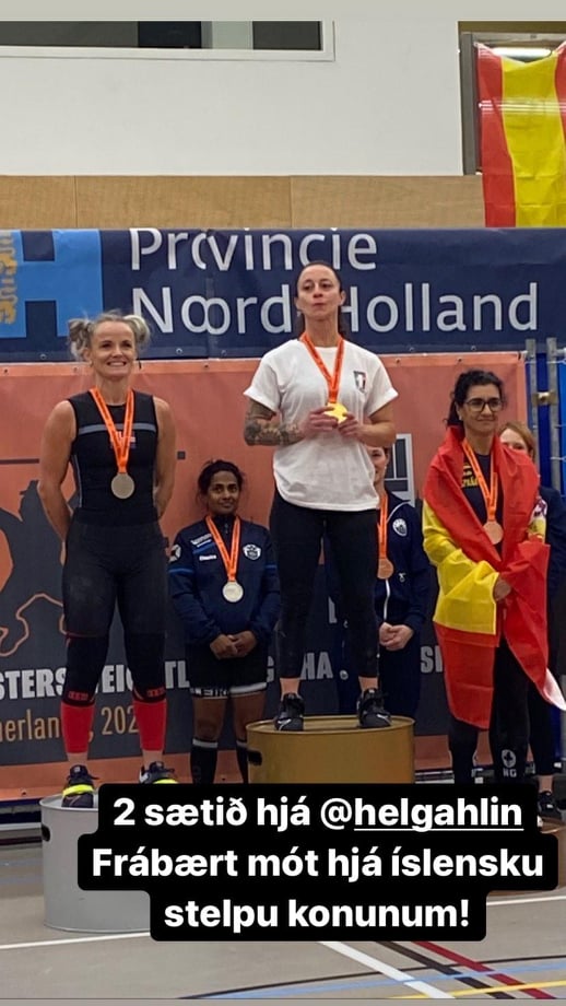 Helga Hlín Hákonardóttir (f. 1972) lendir í því óláni að rífa upp báða lófa í upphitun á fyrir keppni sem leiddi til þess að vel þurfti að búa um lófana áður en hún fór upp á keppnispall þar sem það blæddi mikið. Hafði þetta mikil áhrif á gripið á stönginni og skilaði það sér í að Helga náði ekki eins góðum árangri og hún hafði hug á. Þrátt fyrir að Helga fór rólegra yfir þá náði árangurinn henni 2. sætinu í 59 kg flokki Masters 45 með 48 kg í snörun, 65 kg í jafnhendingu og þá 113 kg í samanlögðum árangri. Svo mögnuð er þessi kona! Vigtuð 57.7 kg skilaði þessi árangur Helgu Hlínar 156.62 sinclair stigum. Helga á mikið inni það er dagsljóst! Það verður skemmtilegt að sjá hana keppa næst ómeidda og sjá hvert sá árangur skilar henni. Til hamingju með frábært mót Helga Hlín! Þú hefur sko aldeilis bein í nefinu!
