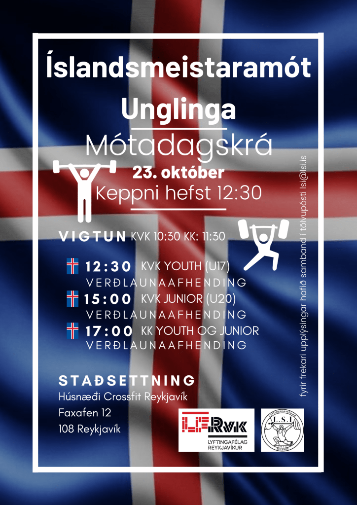 A.T.H. Breytingar á þyngdarflokkum skulu berast á lsi@lsi.is fyrir kl 20:00 daginn fyrir mót, föstudaginn 22. október.