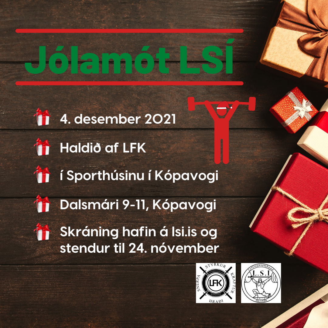Skráningin er hafin á Jólamót LSÍ sem haldið verður af Lyftingafélagi Kópavogs þann 4. desember næstkomandi í Sporthúsinu í Kópavogi. Skráning á mótið stendur til 24. nóvember. Hlökkum til að sjá ykkur í jólafíling á Jólamótinu í ár!