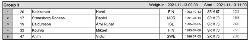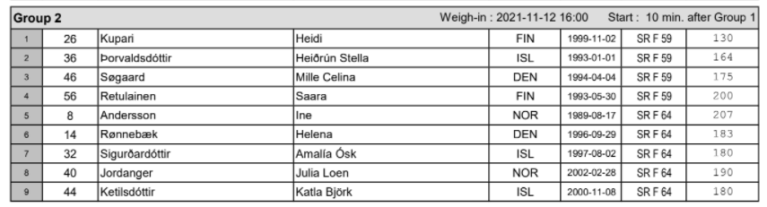 Katla Björk Ketilsdóttir (f. 2000) frá UMFN – Massa hefur keppt frá því 2016 en keppti fyrst fyrir Íslandshönd það ár. Katla á best 83 kg í snörun, 99 kg í jafnhendingu og 182 kg í samanlögðum árangri frá því á á Evrópumeistaramóti U23 í september og heldur íslandsmeti í samanlögðu í U23 og Senior frá því móti. Katla á þó hærra á æfingu og því skemmtilegt að sjá hvað hún næst á mótinu í dag. Þess má geta að Katla stefnir á HM Senior í Usbekistan í desember með 4 öðrum íslenskum keppendum.