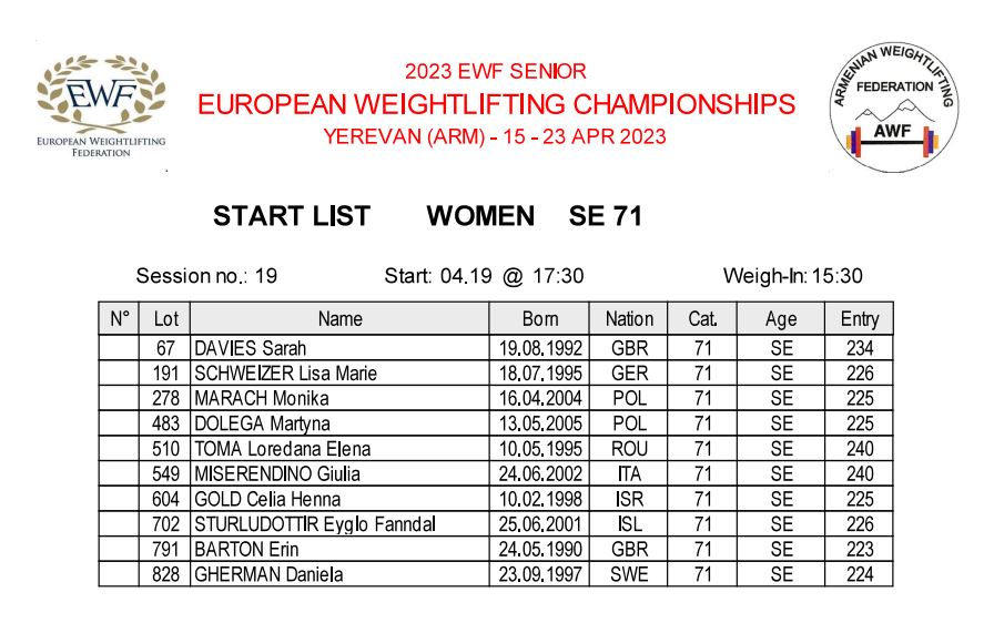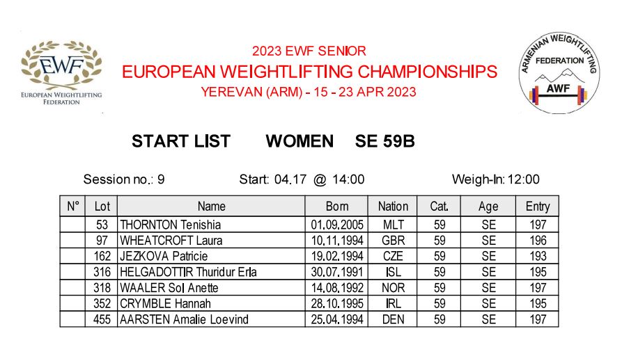 Dagskrá Evrópumeistaramótsins í Yerevan, Armeníu má finna á heimasíðu Evrópska lyftingasambandsins undir “Start book”.