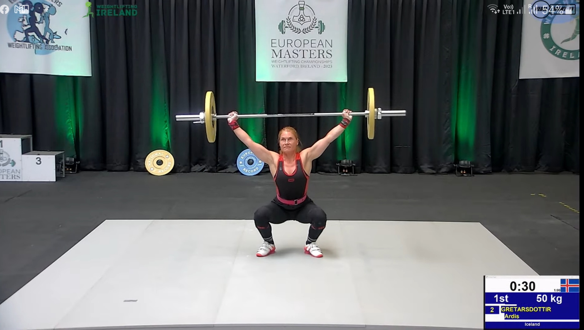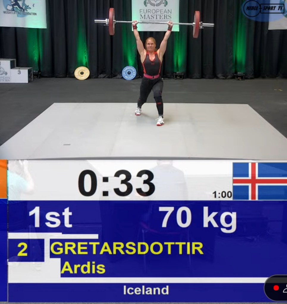 Árdís Grétarsdóttir endaði í 3. sæti í -64kg flokki 50-54 ára kvenna eftir harða keppni og æsispennandi tilraunir við bætingar á Evrópumeti sem hún setti í fyrstu jafnhendingu.
