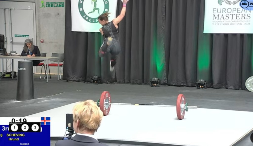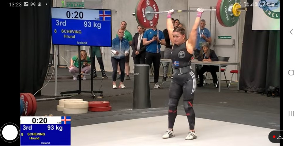 Hún tók hins vegar 72kg örugglega í þriðju og síðustu tilrauninni sinni og sigraði með því snörunar hluta flokksins auk þess sem 72kg eru nýtt Evrópumet og jöfnun á Heimsmeti í flokkinum hennar. Hrund fagnanði að sjálfsögðu eins og henni er einni lagið.