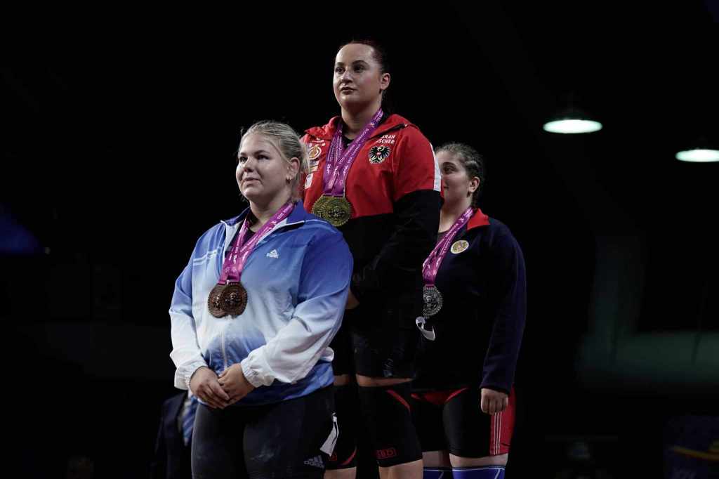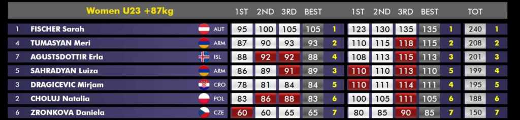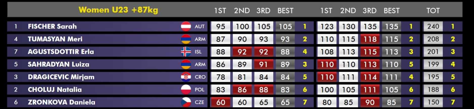 Sahrah Fischer frá Austurríki sigraði flokkinn mjög örugglega með 240kg samanlagt og Meri Tumasyan frá Armeníu var í öðru sæti með 208kg samanlagt.