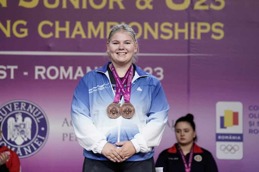 Erla Ágústsdóttir er gerði lokakaflann á Evrópumeistaramótinu í Búkarest svo sannarlega eftirminnilega með því að taka 2 brons með heim af keppnispallinum í dag.