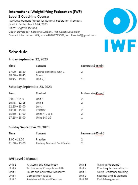 Námskeiðið er styrkt af IWF Development Program og því getum við boðið meðlimum lyftingafélaga þetta á þessu frábæra verði.
