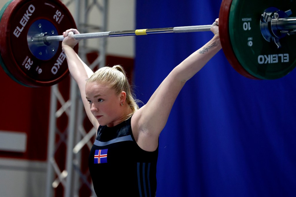 Guðný lyfti 90kg í snörun og 103kg í jafnhendingu, en það er 8 kg bætin í jafnhendingu á móti, samanlagt 193 kg og náði með því C lágmörkum á EM 2024.