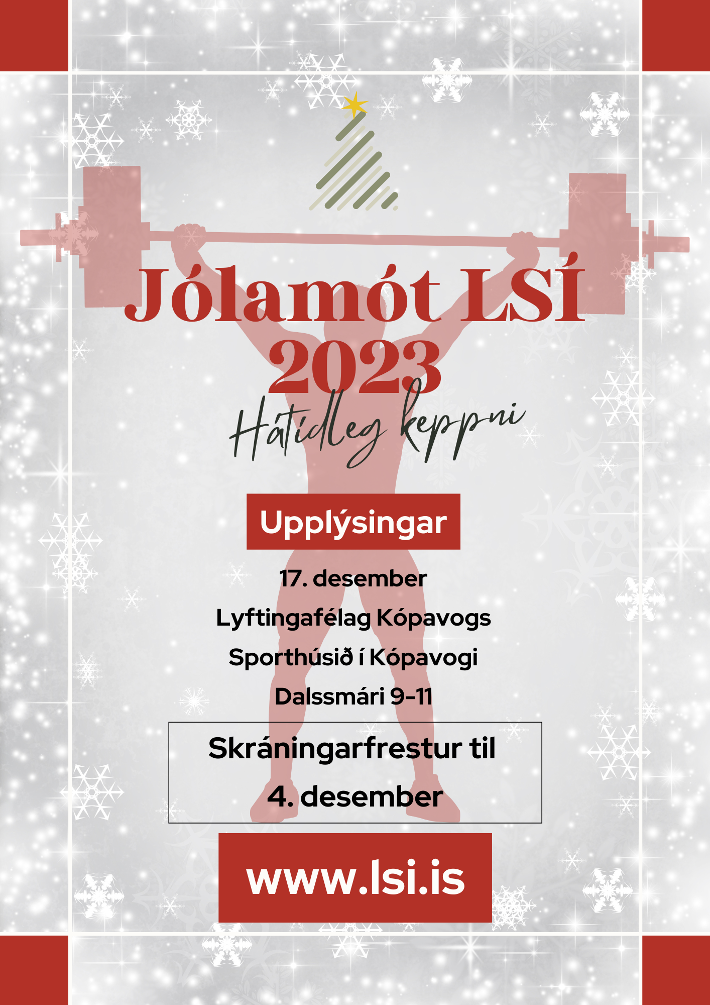 Jólamót 2023 – Mótshaldari og dagsettning Birt þann desember 2, 2023 af María Rún Þorsteinsdóttir Skráning HÉR til 4.des! Deila: Click to share on X(Opnast í nýjum glugga) X Click to share on Facebook(Opnast í nýjum glugga) Facebook Click to share on LinkedIn(Opnast í nýjum glugga) LinkedIn Líka við Hleð... Tengt efni