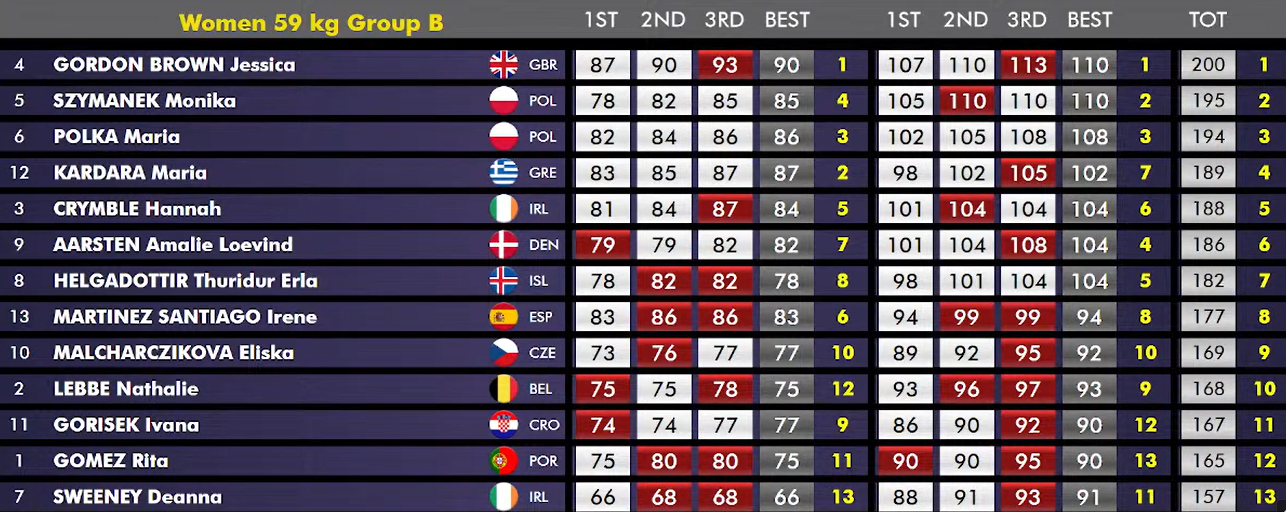 Íslandsvinkonan Saara Retulainen átti stórgott mót og kom mjög að óvart þar sem hún snaraði 95kg (bæting á norðurlandametinu í -59kg flokki um 4kg) og jafnhenti 119kg sem er bæting á norðurlandametinu um 1kg. Þessi árangur tryggði henni bronsverðlaun samanlagt í -59kg flokknum og fer hún úr 27.sæti á OQR í það 16. (en á þó eftir að uppfæra listann eftir Asíu og Afríkuleikana).