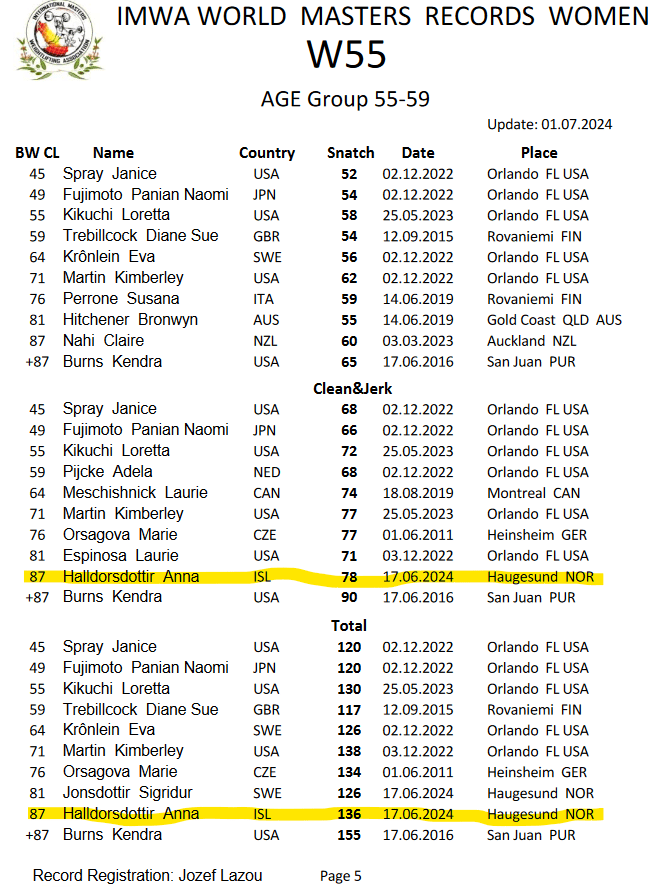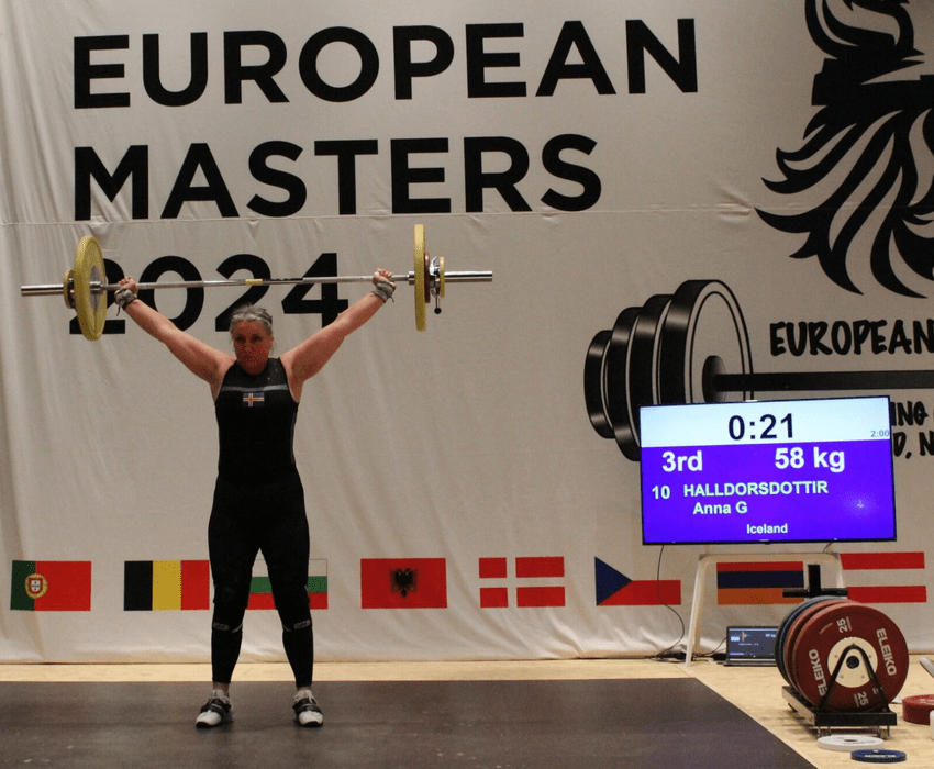 Anna Guðrún Halldórsdóttir keppti í flokki -87kg í aldursflokki 55-59 ára og sigraði flokkinn. Hún setti einnig ný íslandsmet í Masters flokki 58kg í snörun, 78kg í jafnhendingu og 136kg í samanlögðum árangri. Að auki er jafnhendingin og samanlagði árangurinn ný HEIMSMET í Masters flokki 55-59 ára.