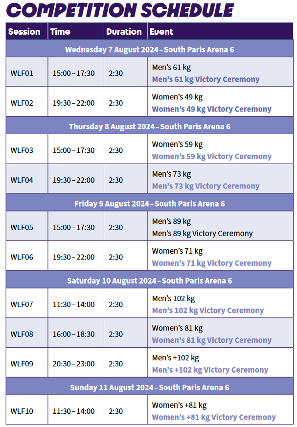 Hér má sjá upplýsingarit leikana um ólympískar lyftingar: https://iwf.sport/wp-content/uploads/downloads/2024/07/Paris2024_Guide_IF_Weightlifting_EN.pdf