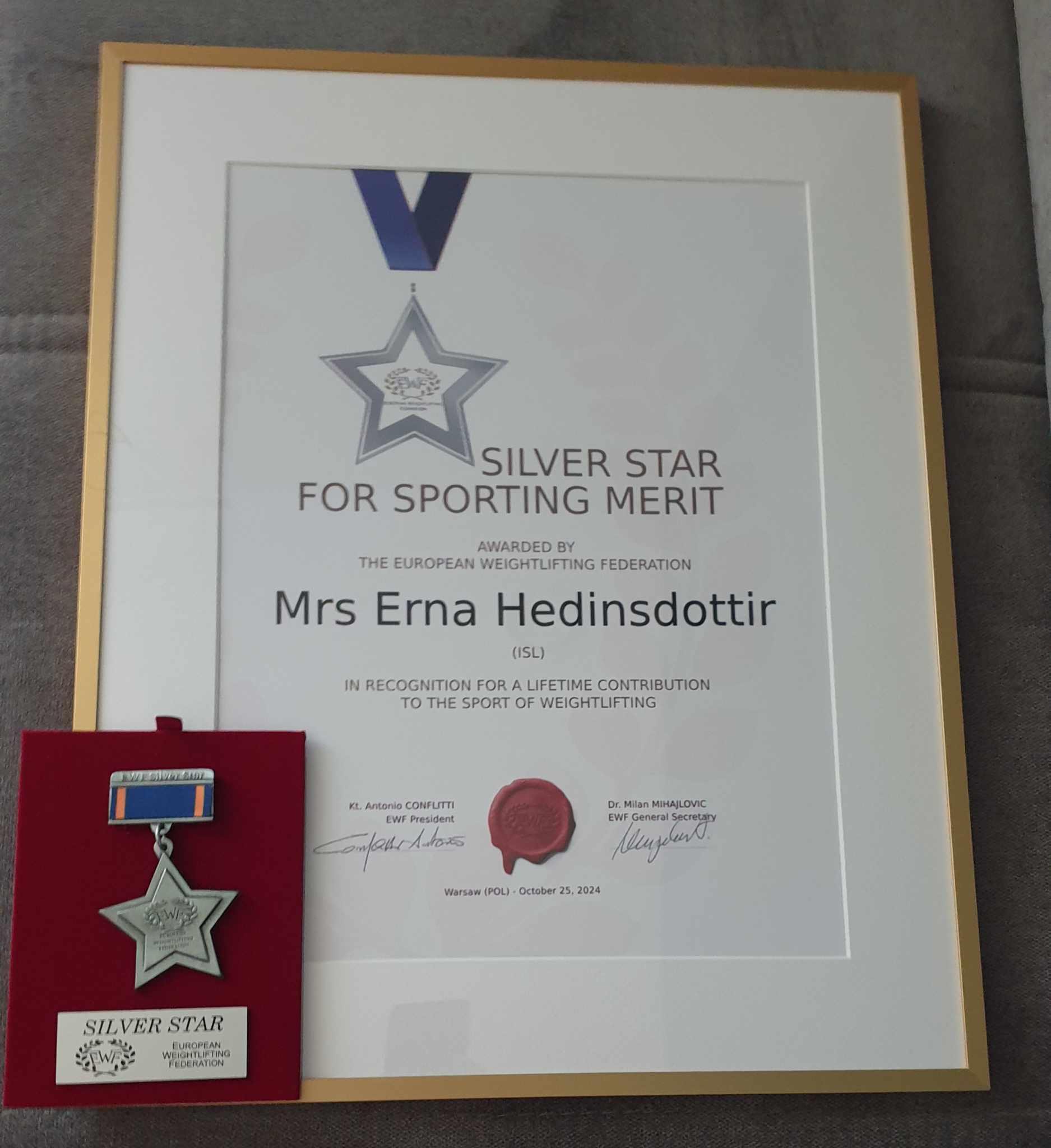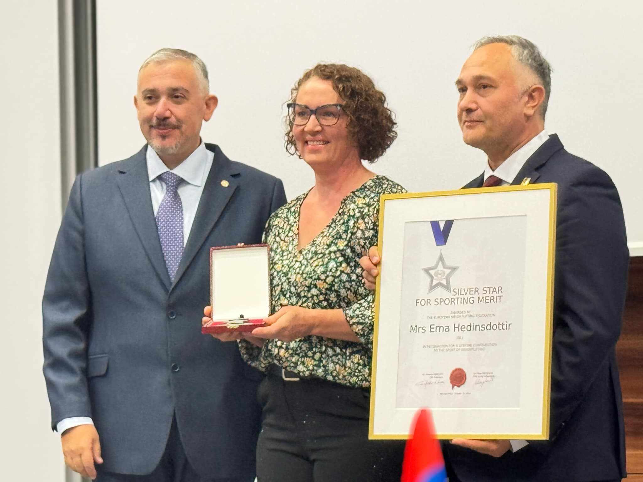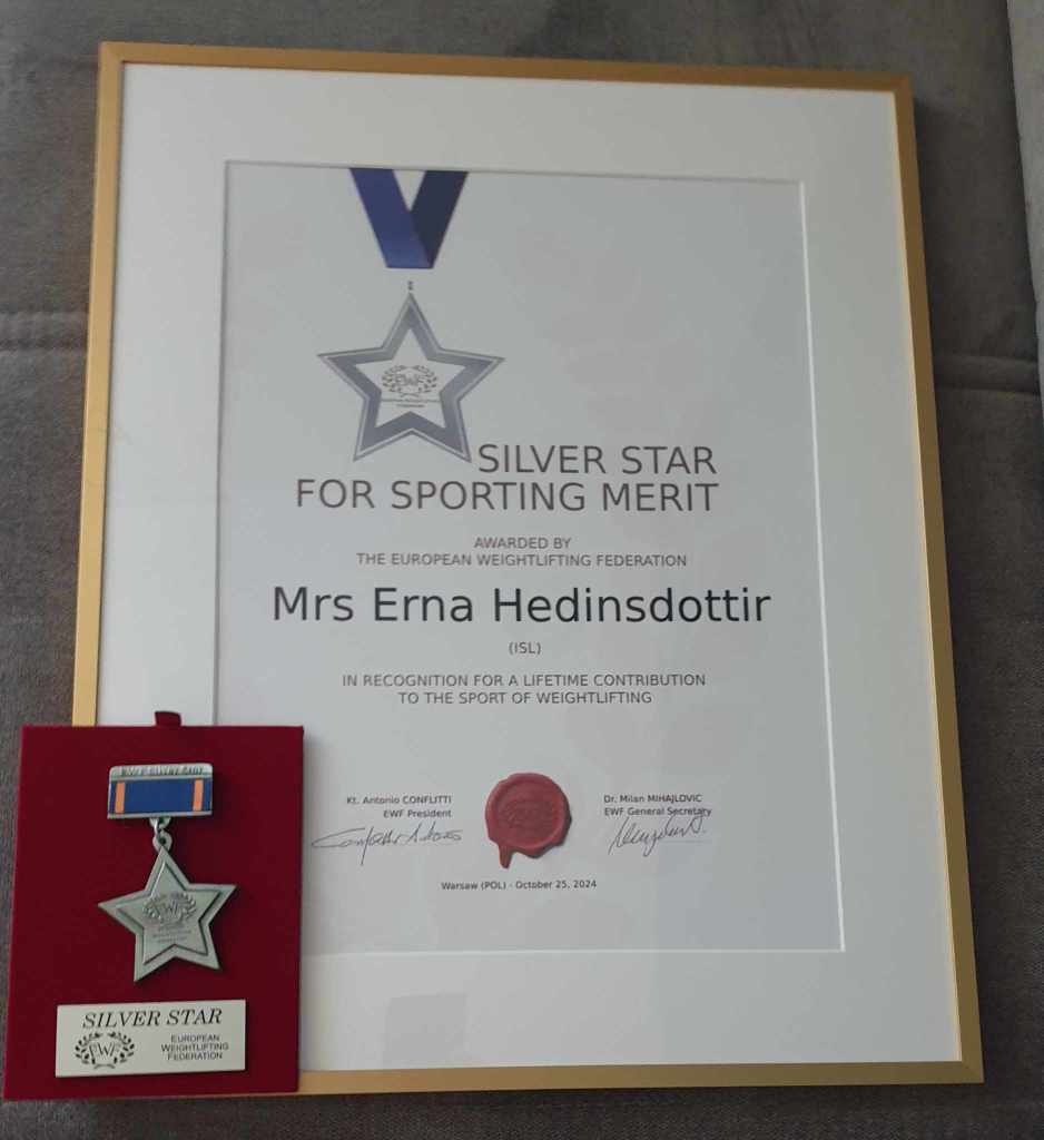 Erna Héðinsdóttir alþjóðadómari og stjórnarmaður lyftingasambands Íslands hlaut fyrst Íslendinga silfurstjörnu evrópska lyftingasambandsins (EWF) sem henni var afhent í Raszyn í Póllandi í tengslum við Evrópumeistaramót Ungmenna.