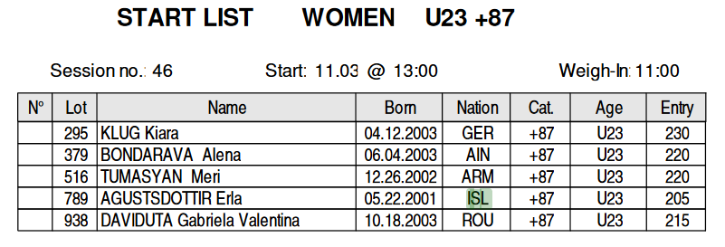 3. Nóvember klukkan 13:00 að staðartíma (12:00 íslenskum) keppir Erla Ágústdóttir