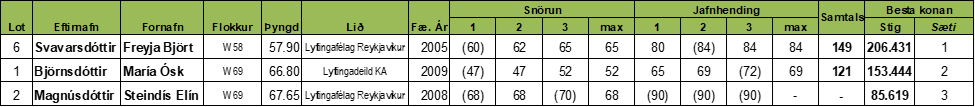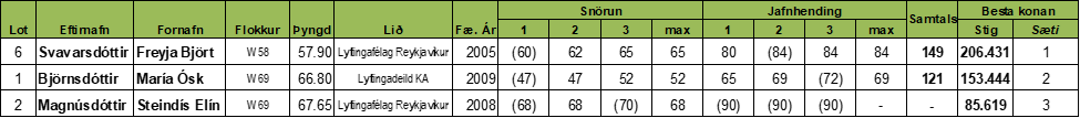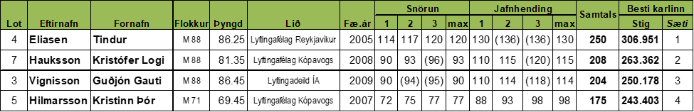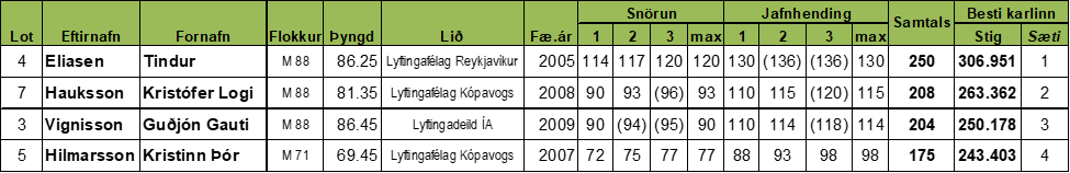 Mótið er stigamót og ekki keppt í eiginlegum þyngdarflokkum heldur á Sinclair stigum en hinsvegar er árangur keppenda skráður í nýjum þyngdarflokkum. Unnið er að því að koma nýja þyngdarflokka kerfinu upp í gagnagrunni sambandsins (results.lsi.is) og koma úrslitin þangað á allra næstu dögum.